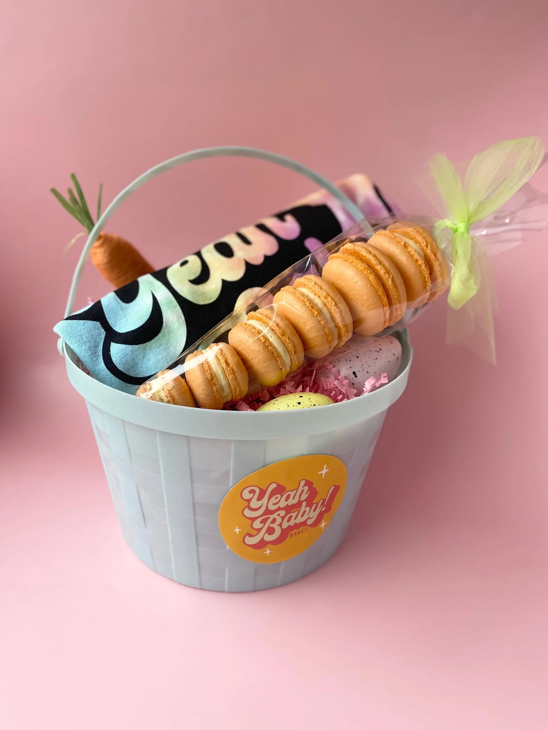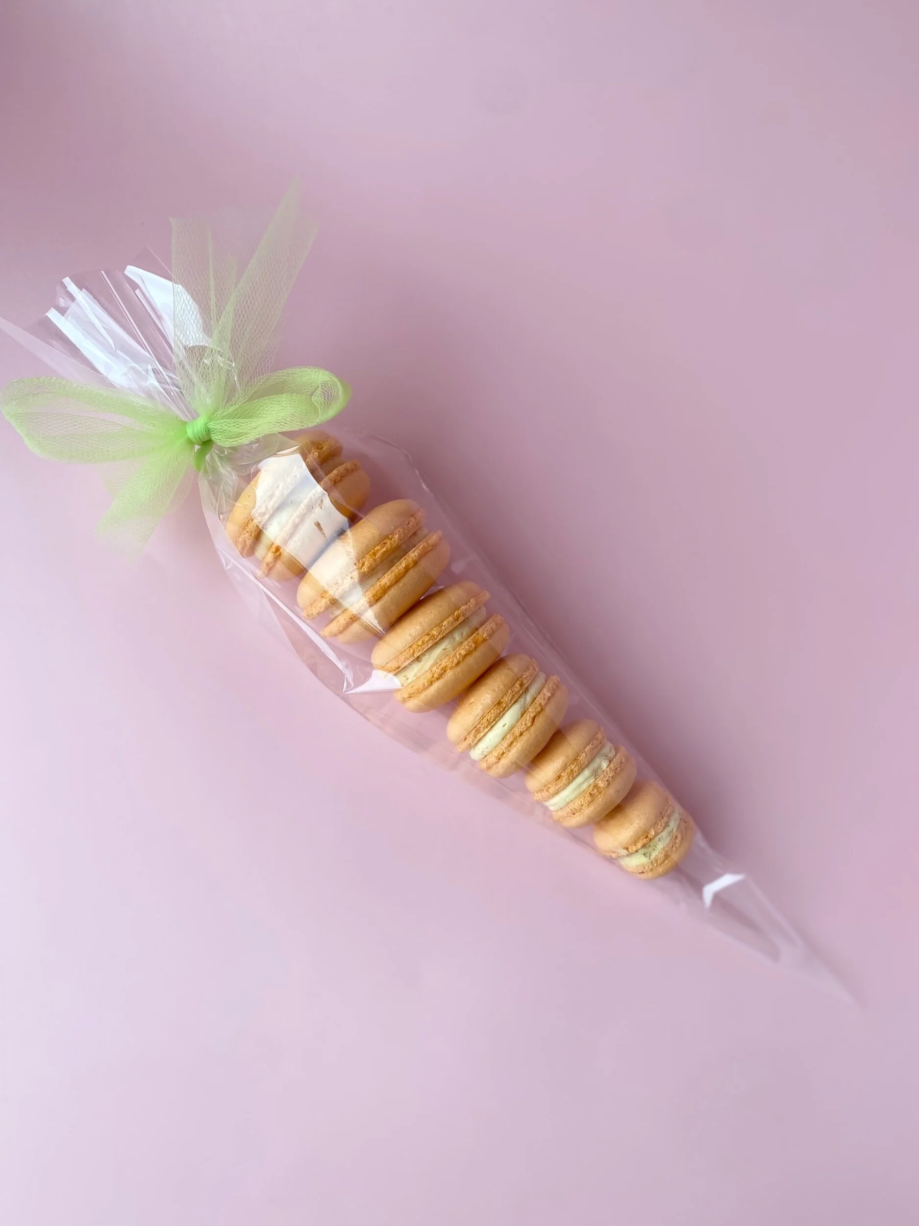 6 birthday cake flavored macarons of various sizes in a carrot shaped sleeve for gift giving. Makes a perfect addition to any easter basket.