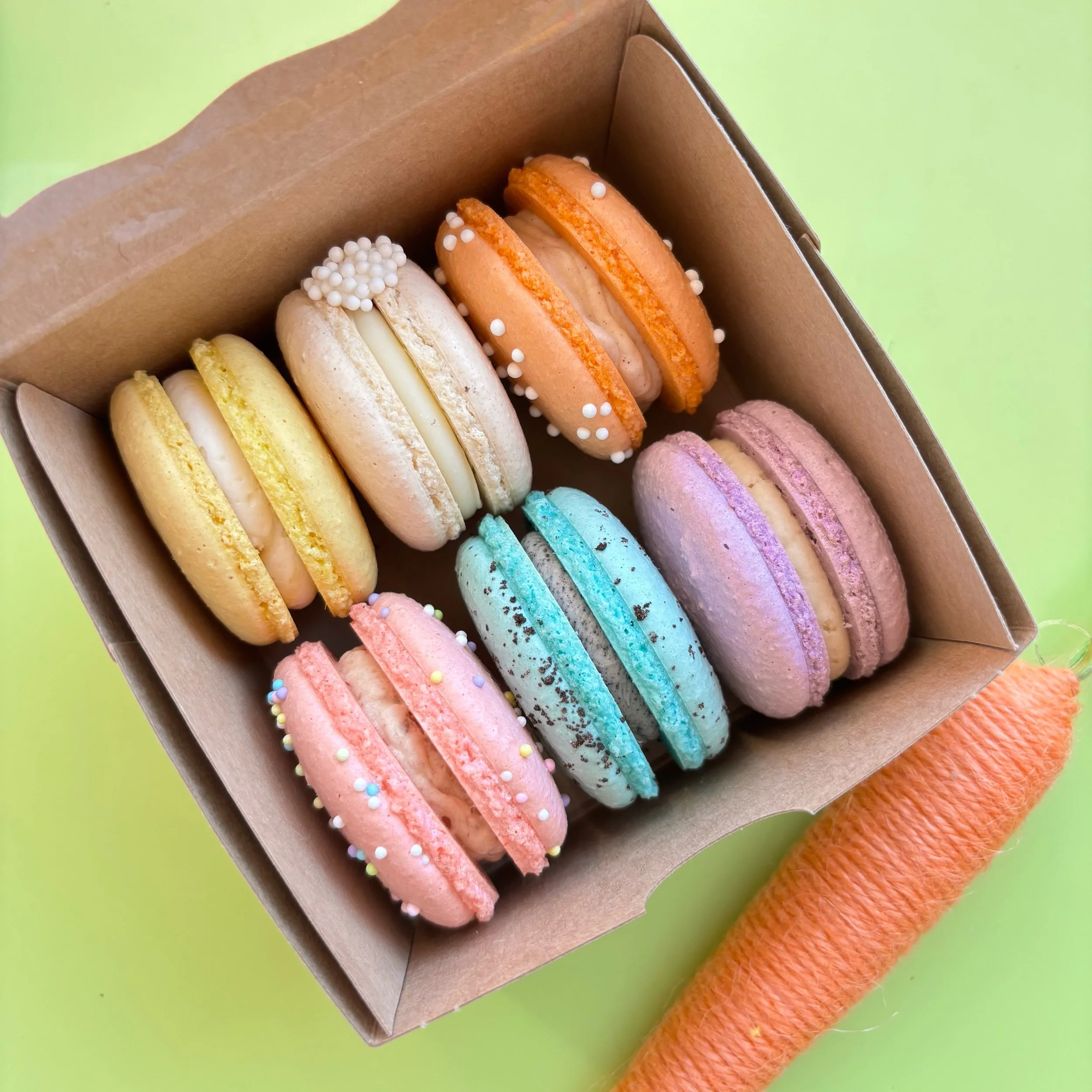 Easter themed macaron box includes 1 of each of the following flavors: