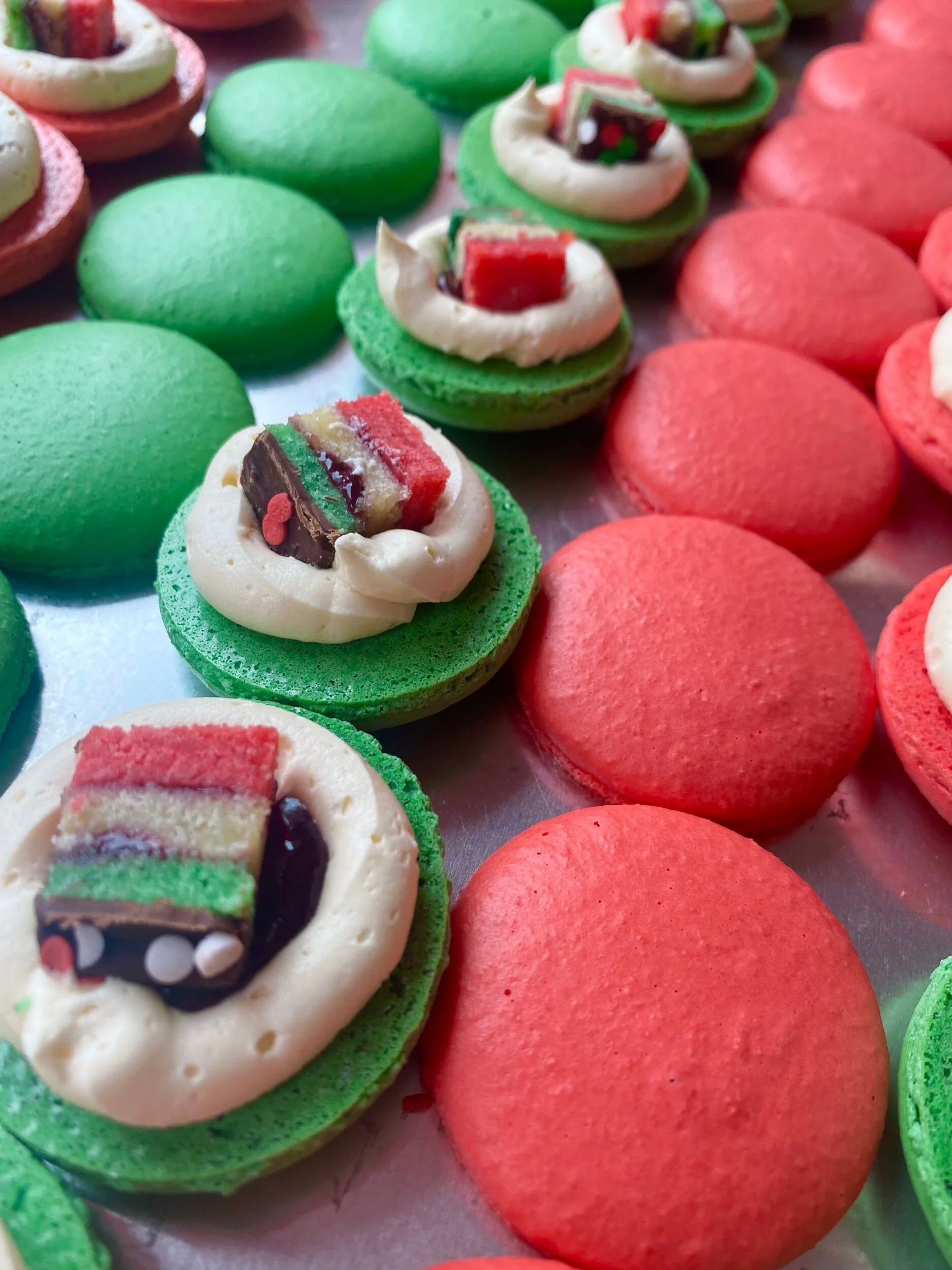 Almond flavored buttercream filling with raspberry jam, a slab of the actual cookie, and chocolate dipped macaron shell top.
